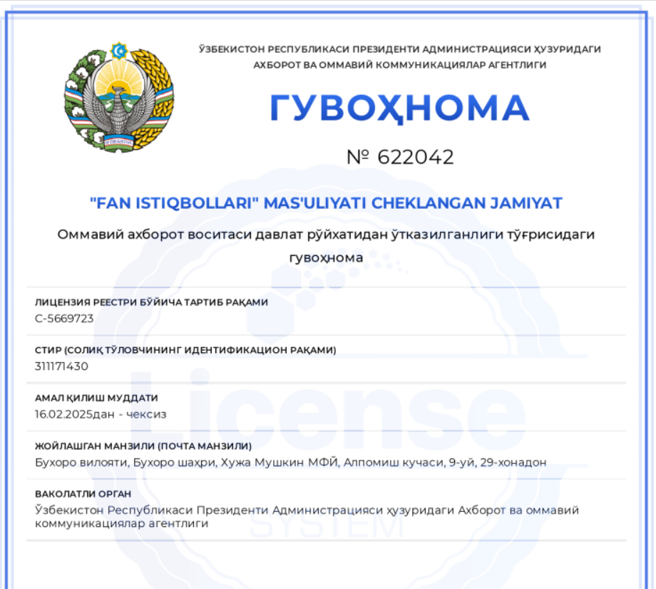 Jurnal Oʻzbekiston Respublikasi Prezidenti Administratsiyasi huzuridagi Axborot va ommaviy kommunikatsiyalar agentligi tomonidan 2025-yil 16-fevral kuni № 622042-sonli guvohnoma bilan roʻyxatga olingan.